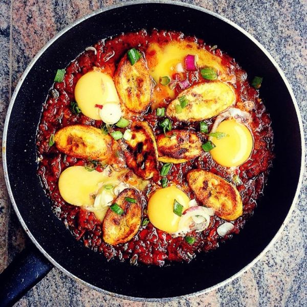 It's like one big tostones covered with tomato sauce, cheese, and vegetables. The sweetness of the blackish brown plantains serve as a contrast against the tang of the red sauce. (via Healthy Nibble Bits)