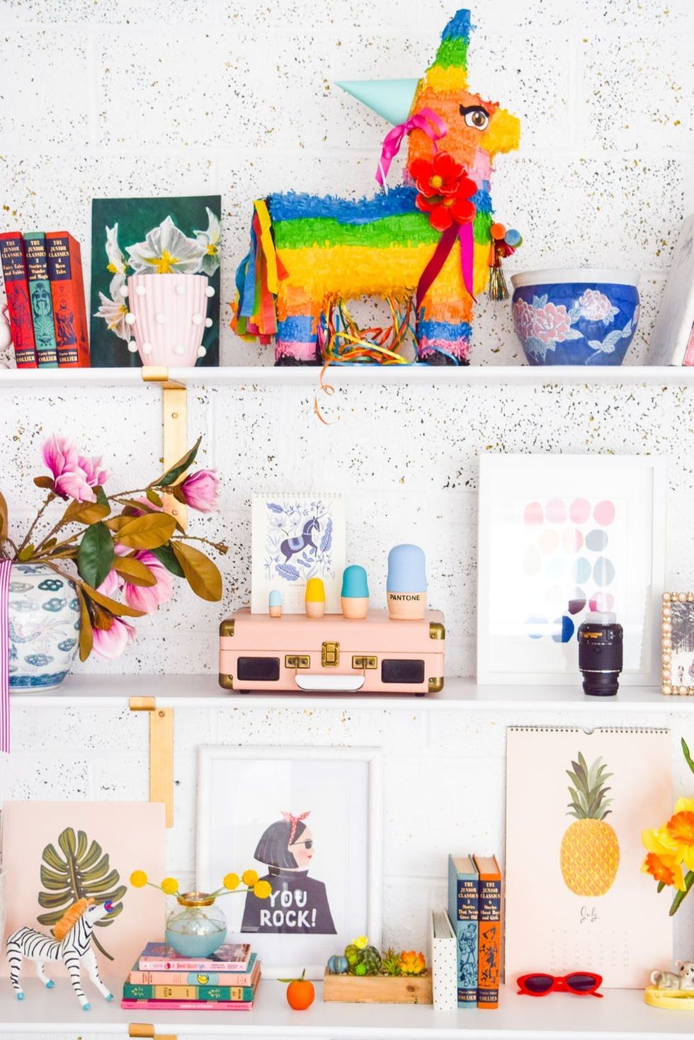 “I wanted [it] to feel playful, empowering, and serve as a functional extension of the rest of the space,” says Garneau. “Some of the areas within the studio are super staged, but my office/desk doesn’t get shot much, so it could be a little more fun.” Fun is a major understatement here. The shelves are packed with so many quirky and unique tchotchkes that we can’t decide where to look first. But under the knickknacks and toys, there’s a strong current of girl power running through the entire office. “As a strong female businesswoman, I also wanted it to convey those vibes. I think my choice of art prints does it,” she says.