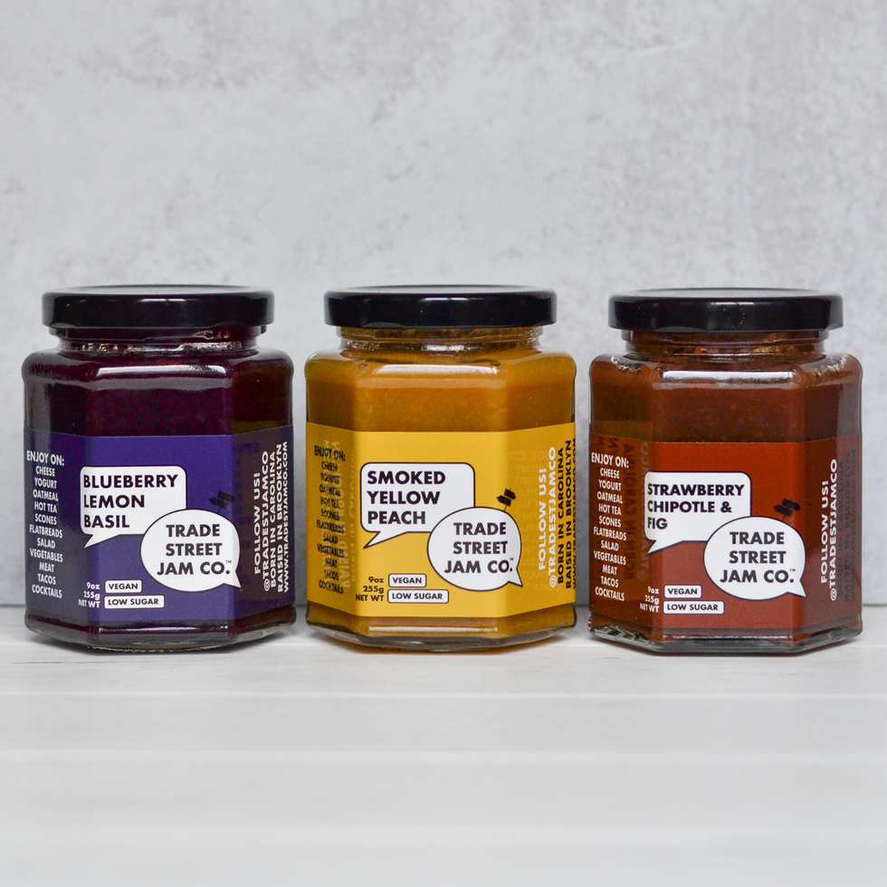 Trade Street Jam Co. is a Brooklyn-based small batch jam company founded by Ashley Rouse, a former chef. Her clean-tasting vegan jams are low in sugar and great to toss in craft cocktails, BBQ sauces, glazes for meats or vegetables, baked goods, and more! Try this trio of their bestselling favorites, including Blueberry Basil Smash.