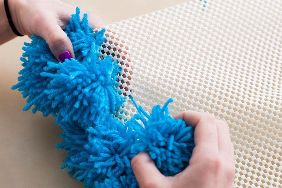 3. Once you have enough pom poms start tying them onto the rug pad. Then hang it, drape it or add it to your floor!