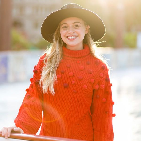 Pair the bold red sweater with neutrals like blacks or grays. Top off the whole look with a cute accessory like a hat or bucket bag.