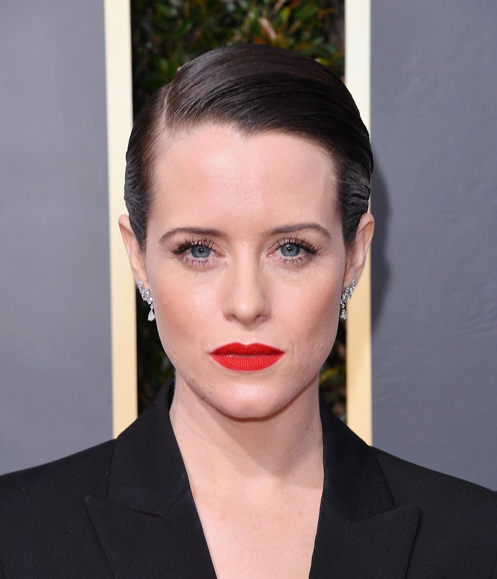 3. Claire Foy: A shiny, slicked-down coif like Foy’s is the perfect ‘do to rock with a menswear-inspired outfit. (Photo via George Pimentel/Getty)