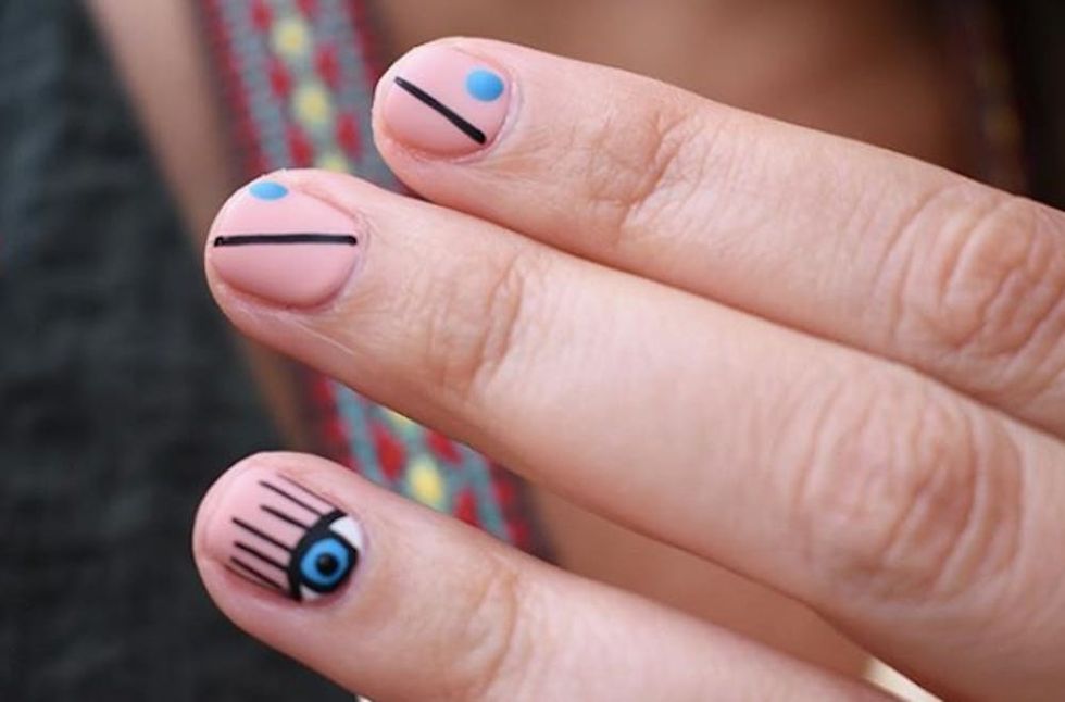 Create the look with a toothpick and a thin brush. Paint your nails a bright color (you can also go big and apply a different shade on each finger), then dip the paintbrush into black polish and outline your fingernail. Next, coat the tip of a toothpick in white polish and trace a long, thin line on the same side of each nail and then a short, rounded line on the opposite bottom corner. For a finishing touch, add a small dot of white polish at the end of the long line and top with a glossy topcoat. (Photo via Wild Oleander)