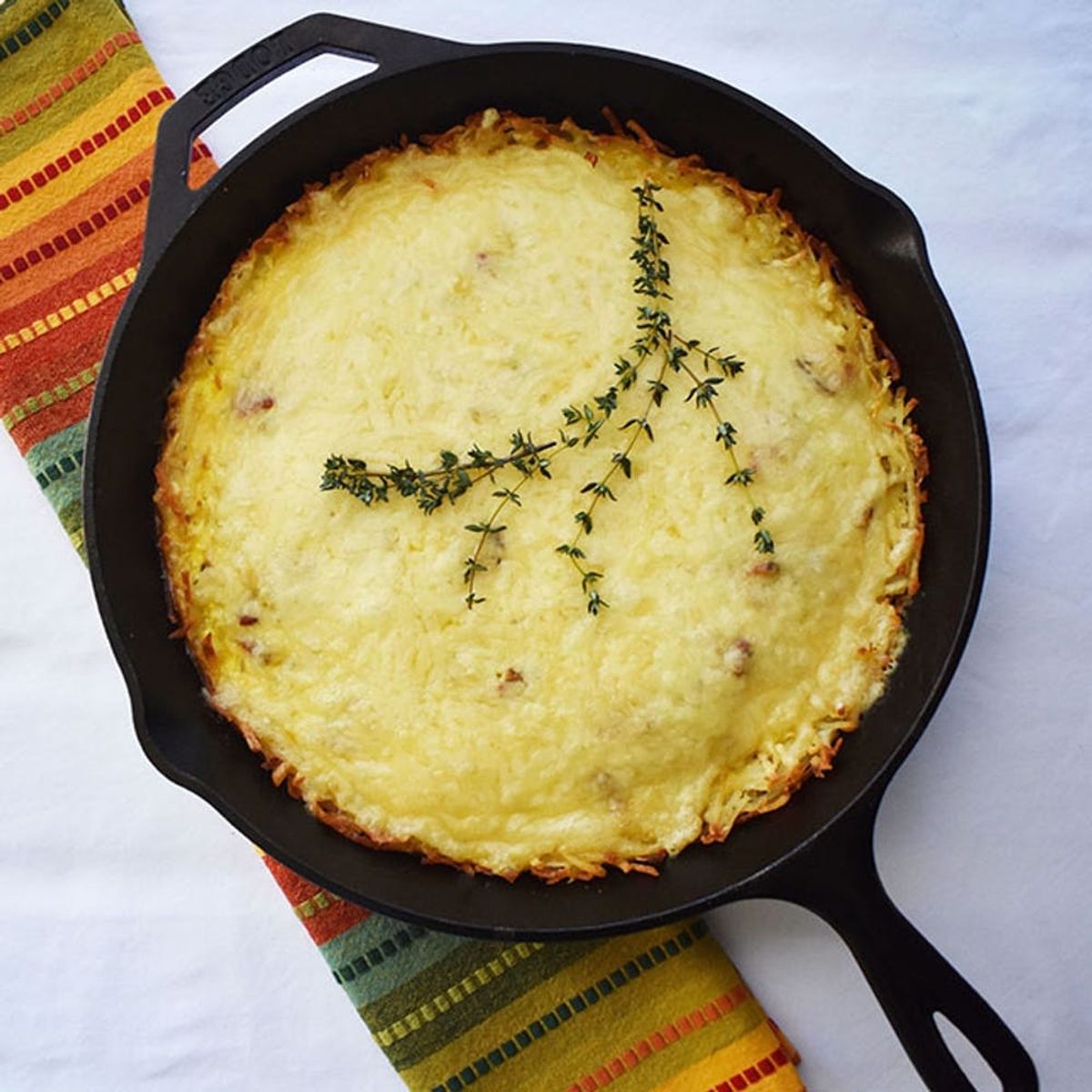 You’ve seen (and likely loved) quiche Lorraine, but not quite like this. Picture its silky egg filling, salty lardons, and savory Gruyère with one key twist: It’s cradled not by a pastry crust, but by shredded potatoes. The result is a trendy, tasty take on a classic French dish, sure to pleasantly surprise guests at your next brunch.