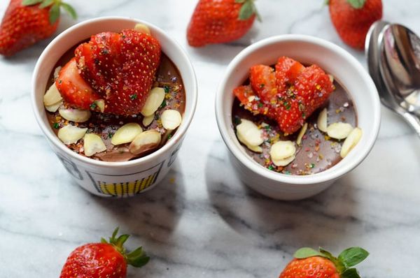 Ok, so we won’t get carried away, but traditionally they are served in little pots with lids, ramekins or espresso cups. Of course, it wouldn’t be Brit + Co. without a twist. In addition to spiking these with a bit of rum, we’ve added extra aphrodisiac power with almonds and strawberries. Just remember, we aren’t responsible for what happens after the spoons are licked clean ;)