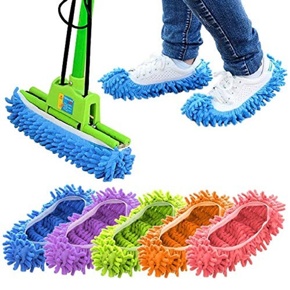 The mop slippers will help you keep a clean floor. They're made of chenille fiber with an elastic band that allows them to fit most people's feet. There are five colors for each pack - blue, green, purple, pink, and orange. You can go barefoot or wear as a shoe cover and clean your floor as you go. If you really want to, you can use the fabric to clean the glass or wash your car.
