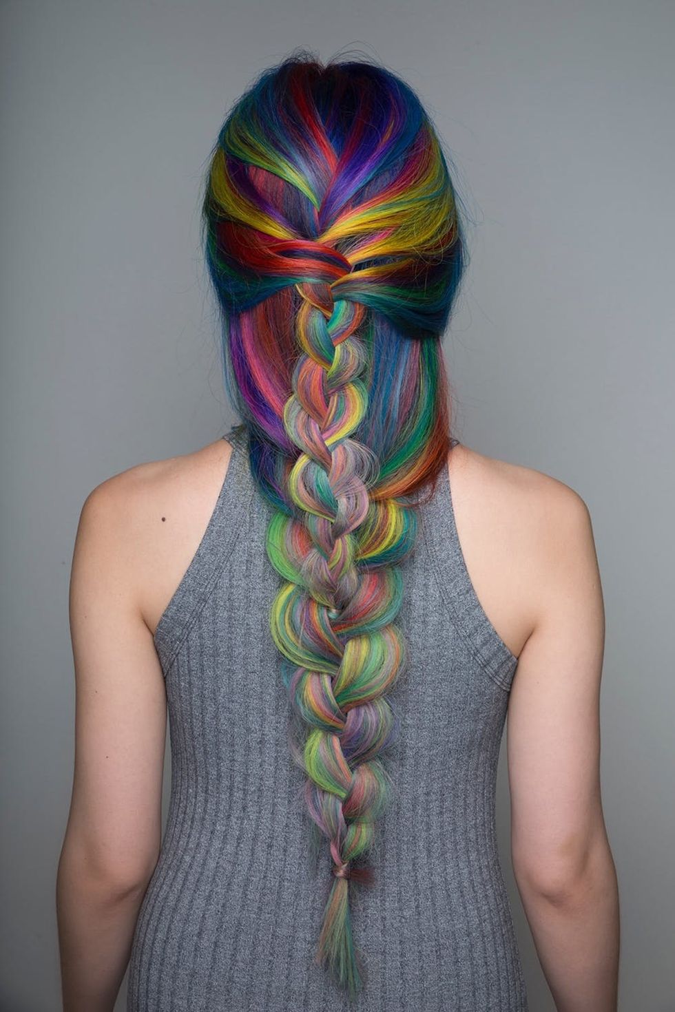 Sporting a multi-colored mane is a trend that’s not going anywhere anytime soon, y’all. Radiant rainbow colors, jewel tones, and, most recently, Fruity Pebble shades have consistently dominated the hair game, but a daring (and mega talented) colorist might have just upped the ante. Hannah Edelman, owner of Brooklyn-based salon Brush in Hand and a guest artist for PRAVANA, was challenged by the hair color brand to create a head-turning, color explosion of a look using a totally insane amount of dyes. Let’s just say that not only did she accept that challenge — she completely slayed it.
