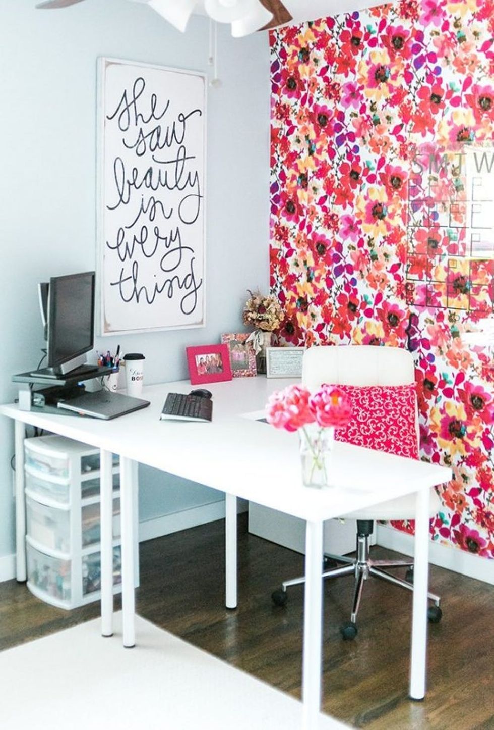 3. Flower Power: Bring some awesome blossoms to your new position with a floral backsplash. If maintenance isn’t onboard with the wall makeover, give temporary wallpaper options a try or use the print as a bulletin board background. (via Amber Oliver)