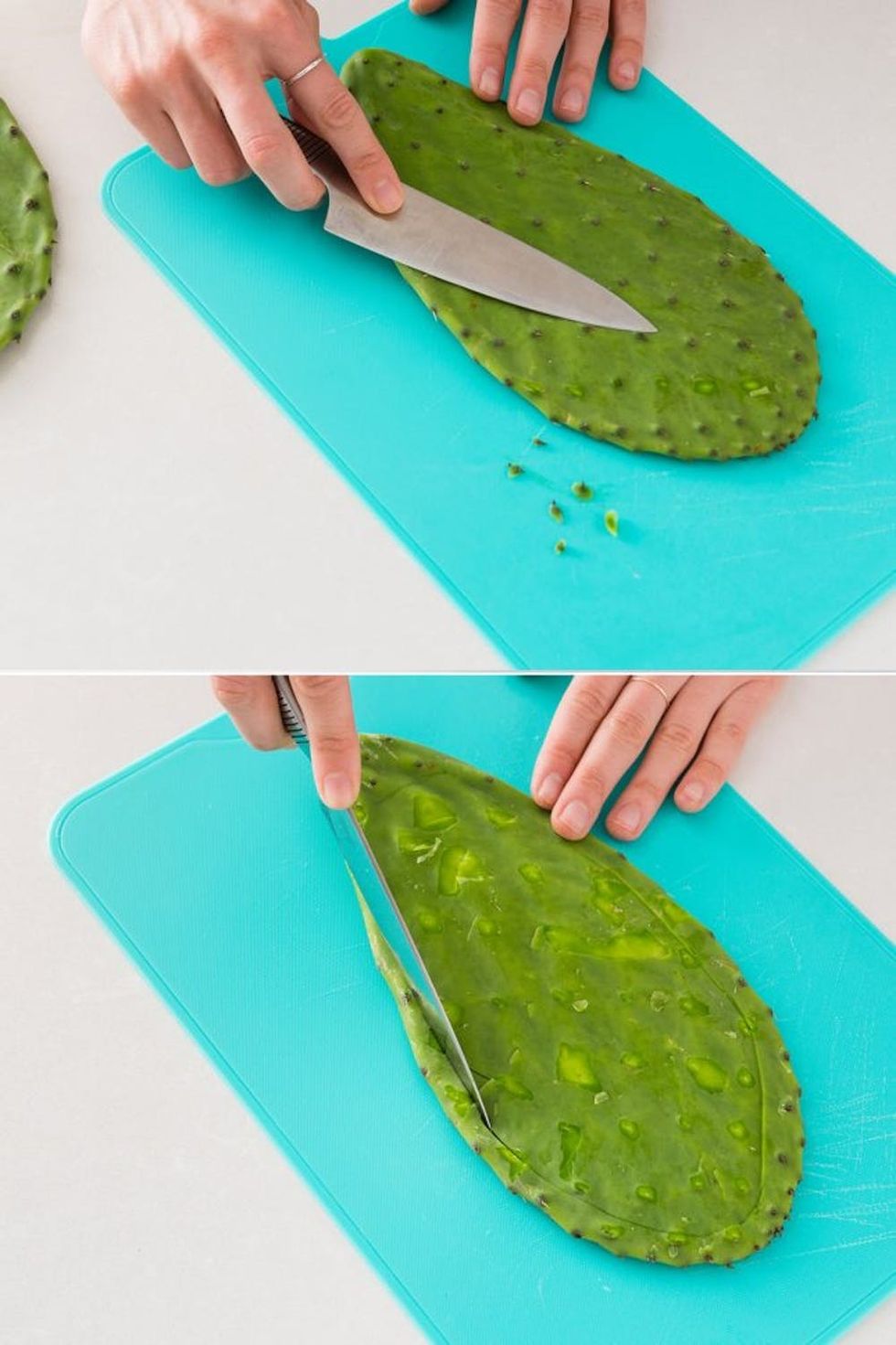 Begin by removing the spines of the cactus pads and trimming the outside edges of the pads.