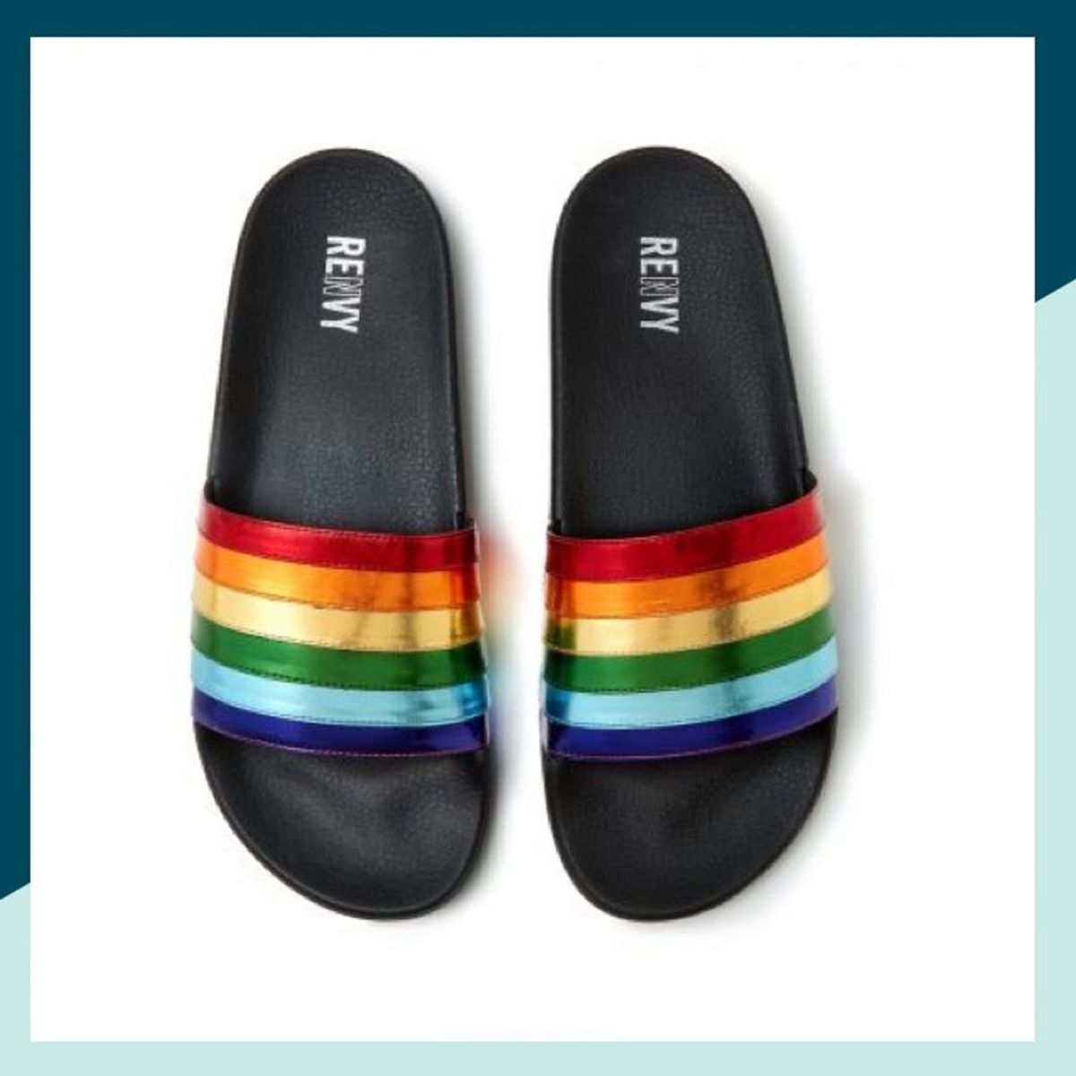 One hundred percent of the brand’s Pride Collection proceeds (up to $25,000; Hollister Co. will donate at least $250,000) are donated to GLSEN, an organization dedicated to ensuring safe, affirming, bully-free schools for LGBTQ+ students. After all, the children are our future.Gilt x Trevor Project Metallic Leather Stripe Slides
