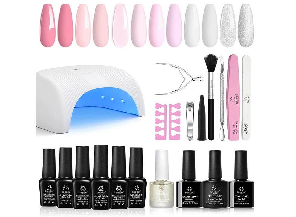 Capture all of the attention you deserve with the Beetles gel polish manicure kit with an included LED drying lamp. This professional set includes a nail lamp, base coat, top coat, and six shades of gel polish in snow white, soft pink, and more. Keep up with the latest nail trends with ease.