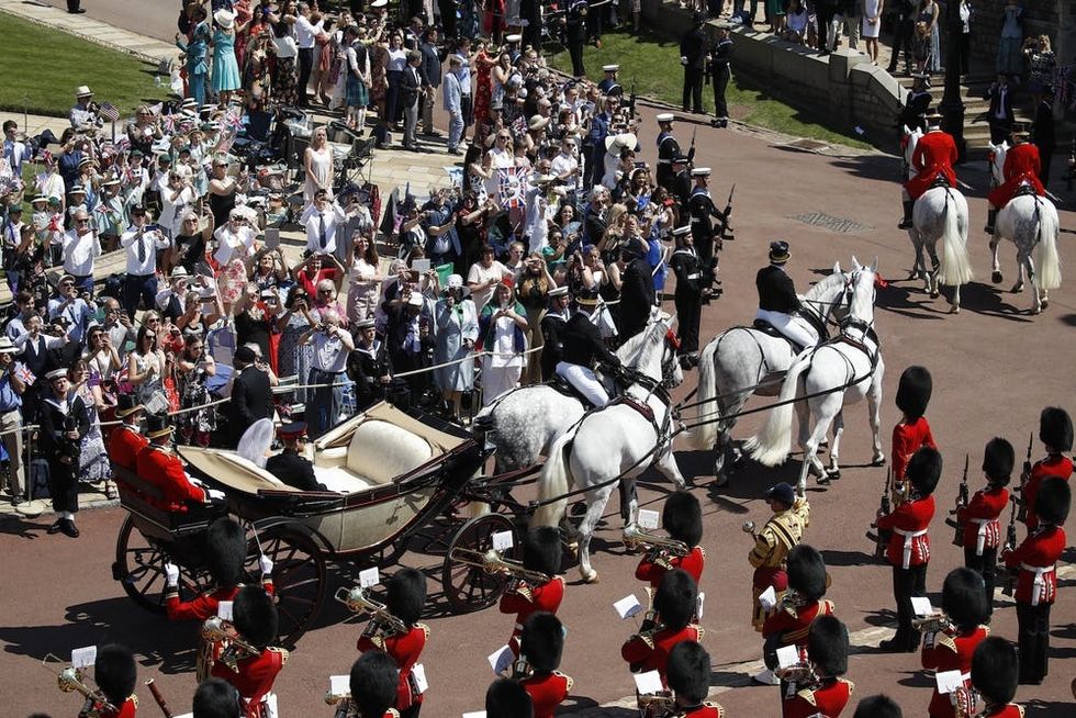 For nearly 30 minutes, the newlyweds waved to the estimated 150,000 royal enthusiasts gathered to see them partake in an age-old tradition as they were pulled through the city by four Windsor Grey horses, including a father and son team called Storm and Tyrone.