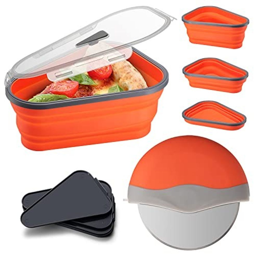 Pizza is so good but we don't feel the same about the pizza boxes. On the rare occasion, there are leftovers, this expandable pizza box can store up to five slices or just one. The silicone triangle container fits much more easily into a fridge or a bag and can be put in the microwave to heat your snack up.