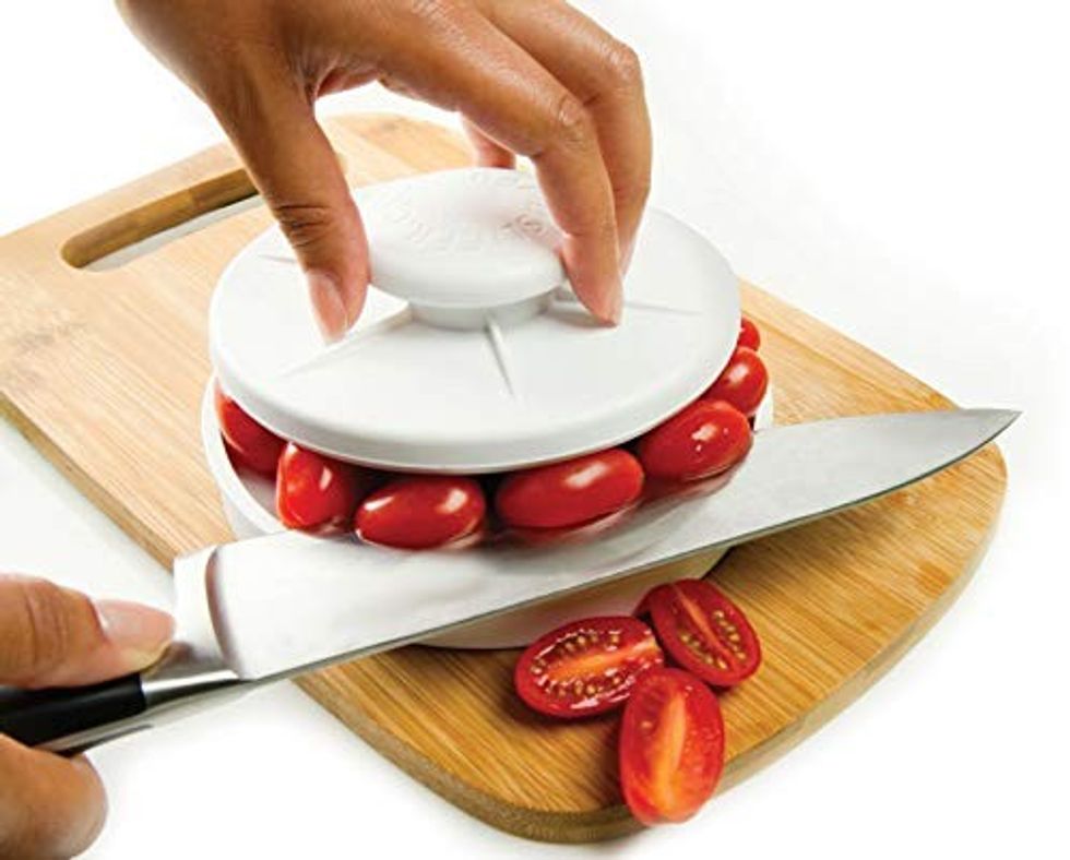 Parents will know that small fruits and veggies can be such a choking hazard for little ones, which is why we love this rapid slicer. You simply pop your food, like cherry tomatoes or grapes in the middle, hold them in place with the handle side and then run the knife through. It's a versatile gadget too as it also works with meat.