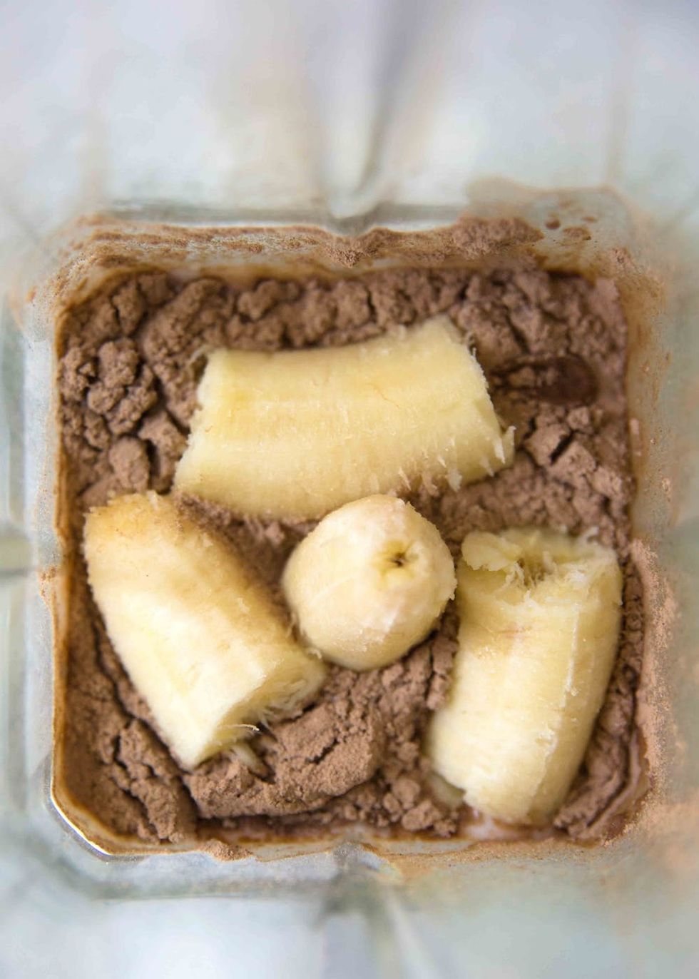 For the chocolate hazelnut protein pops (basically healthy Nutella pops), we blended organic chocolate protein powder with almond milk, coconut milk, hazelnuts, and a banana. Let your bananas ripen to the point of going black and they will be sweeter, making these popsicles juuust right. For a less icy version, just use coconut milk — the fat in a full-fat can of coconut milk makes a popsicle meant to be bitten with more of a chewy texture.