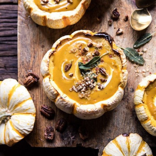 Roasted Garlic Sage Pesto Pumpkin Soup With Spicy Fried Pumpkin Seeds: We might never have thought of combining pesto with pumpkin soup, but now that we know it's possible, it's *kind of* genius, no? This special pesto is sage-based, giving this hearty pumpkin soup an extra dose of fresh herbs. (via Half Baked Harvest)