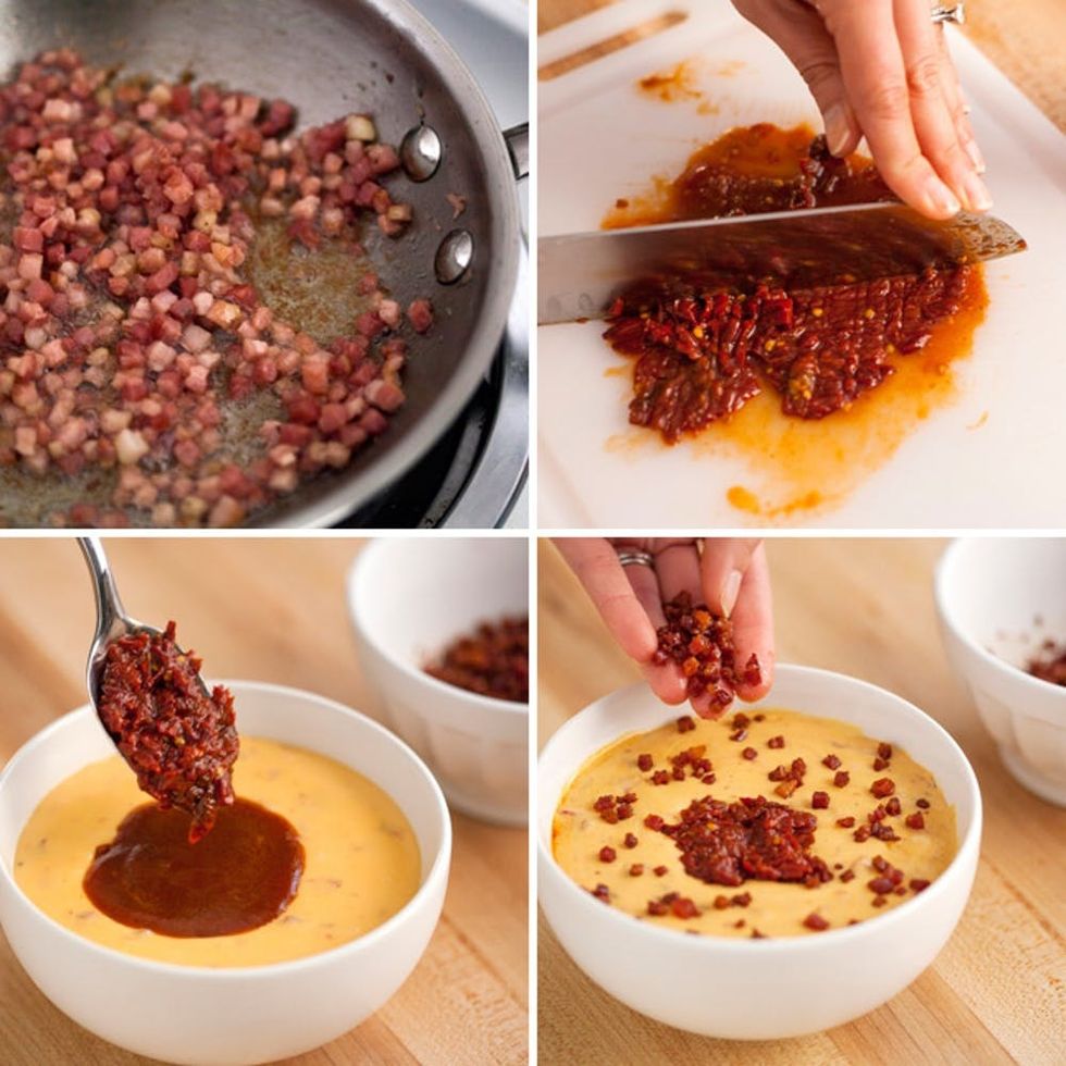 Follow the recipe for basic queso. In a small pan, cook bacon until crispy. Separately, open the can of chipotle peppers and remove the seeds from each pepper. Finely chop and add to queso with bacon, stirring until combined. Serve topped with chopped chipotles and bacon.