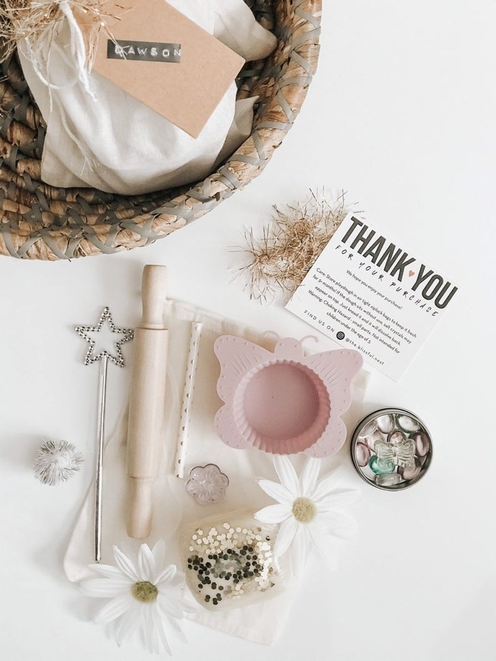 Playdough is perfect for inspiring some quiet creative time. In this canvas bag, you'll score a roll of homemade, non-toxic, scented playdough (glitter optional), sparkly puff balls, butterfly mold, star wand, daisies, straws, a wooden rolling pin, and jewels — makes a great gift too!