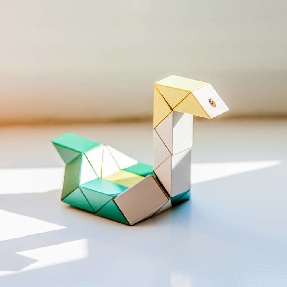 As they sit quietly in their play space, kids can twist their way to all sorts of shapes with these linked blocks.