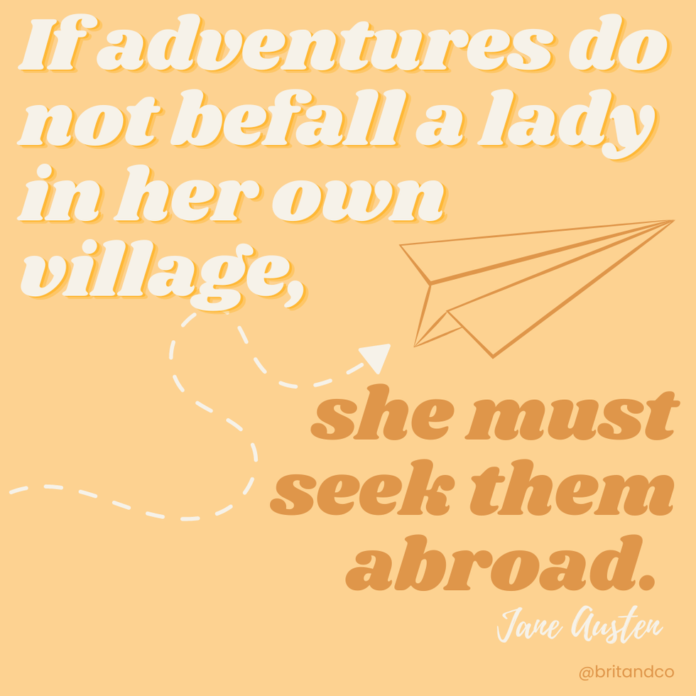 - “If adventures do not befall a lady in her own village, she must seek them abroad.” – Jane Austen