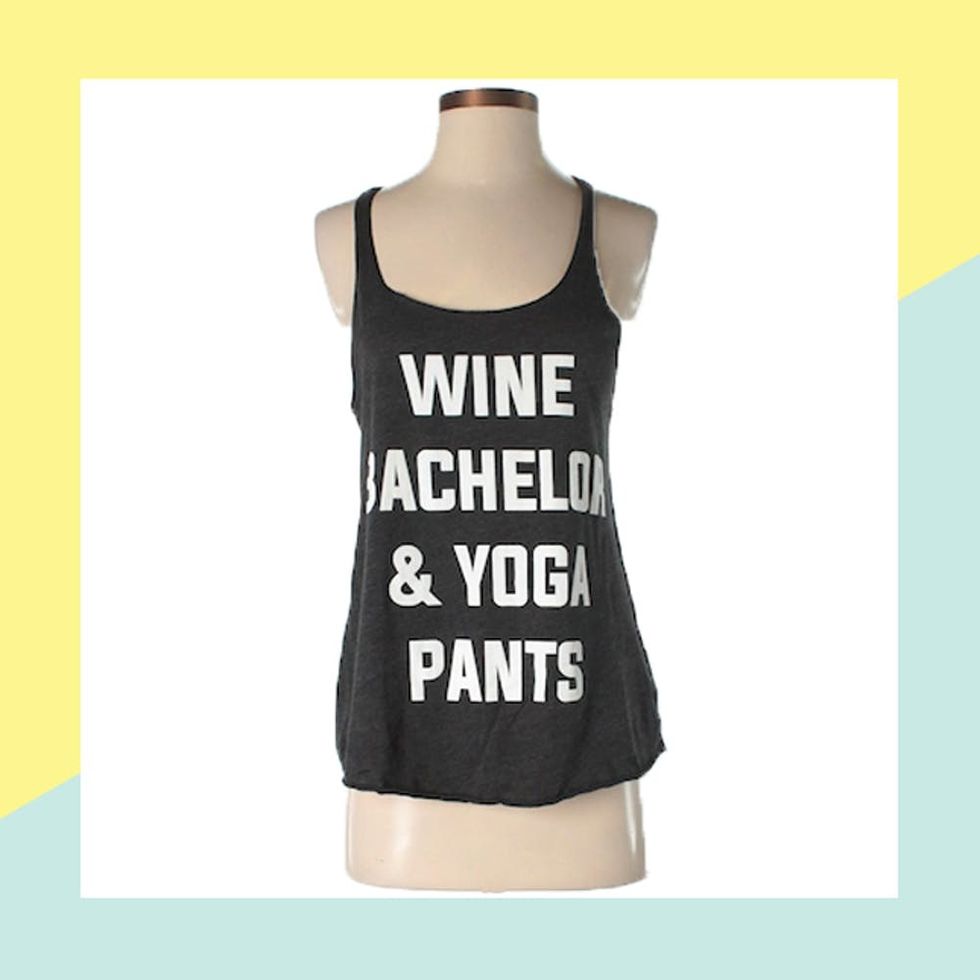 2. Clothing by Owl Tank Top ($50): This medium-sized tank, which reads “Wine, Bachelor, and Yoga Pants,” is perfect for all those Bachelor in Paradiseviewing parties — in fact, Lindsay wore it to watch her own season premiere. “I wanted a super chill watch party with girlfriends in comfortable clothes and drinking wine. This shirt definitely helped me accomplish that,” she said.