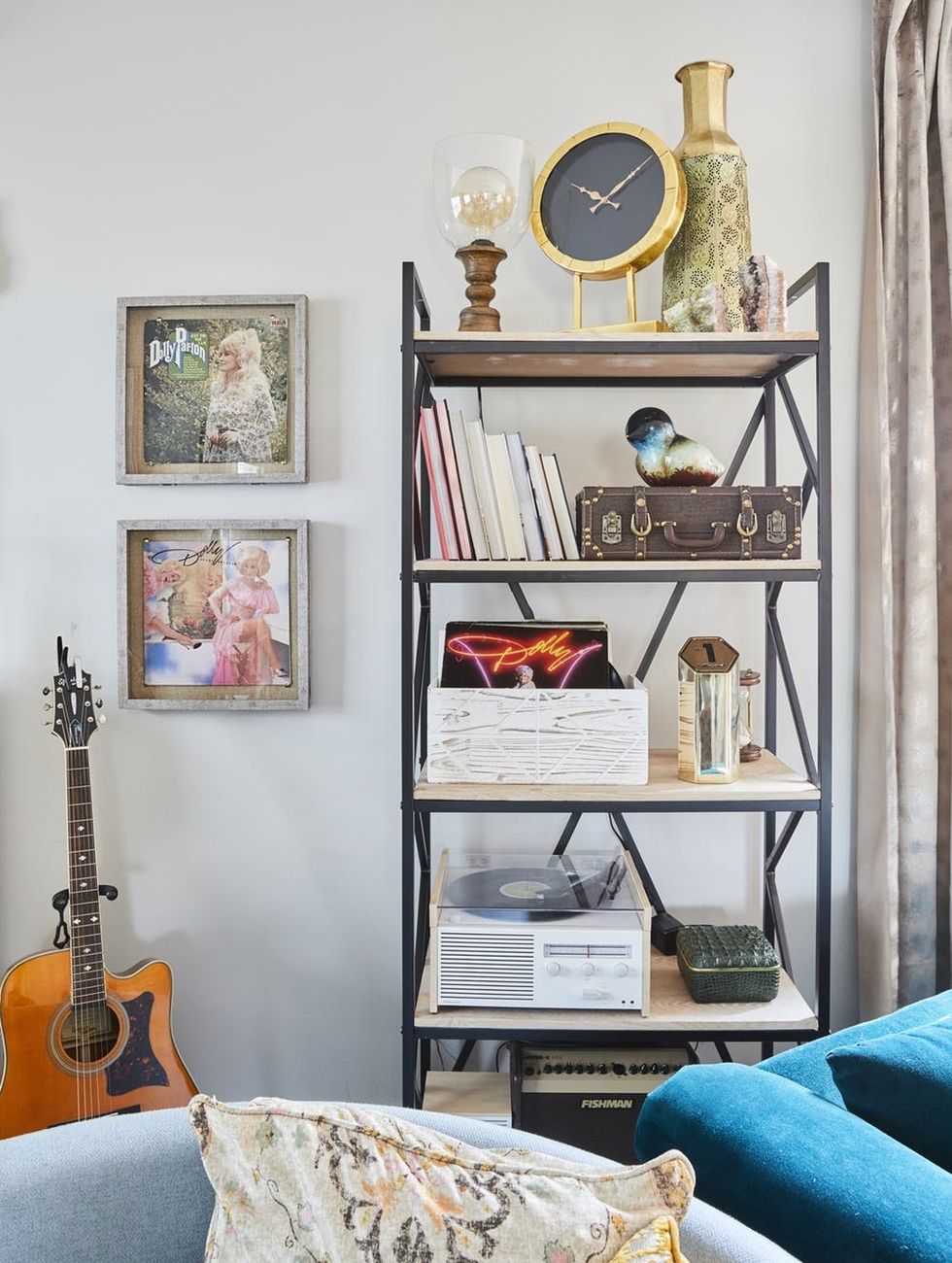 Pattern-mixing was key to achieving RaeLynn’s layered look, beginning with some boho area rugs and extending to all manner of textiles throughout the space. In spite of the riot of patterns, the look works. “It all effortlessly ties to my style of modern meets western with a touch of bohemian,” she says. Dolly Parton is RaeLynn’s “idol”, so finding a way to pay homage to the legendary singer was essential. These shadow boxes do the trick. “Dolly has always been such a huge artistic role model for me. Thinking of her path and listening to her music motivates me to keep driving my own career forward…Now whenever I’m stuck, I can look to her on my wall and feel inspired,” RaeLynn tells us.