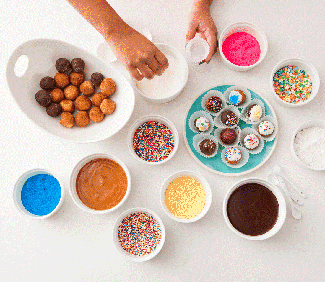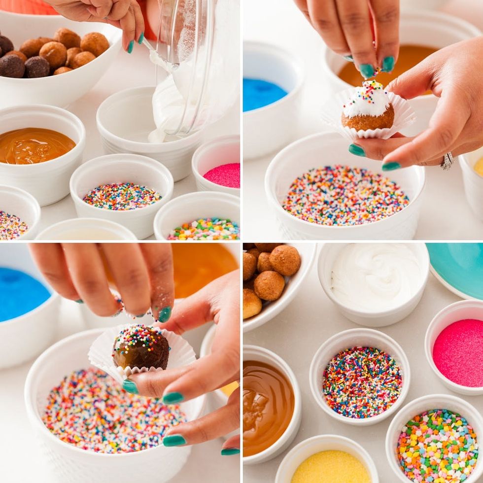 We used an old recipe for spiked frosting from our Strawberry Santas to kick this bar up a notch. Dip a donut hole in your sauce of choice, then top with sprinkles. It’s as easy as that!
