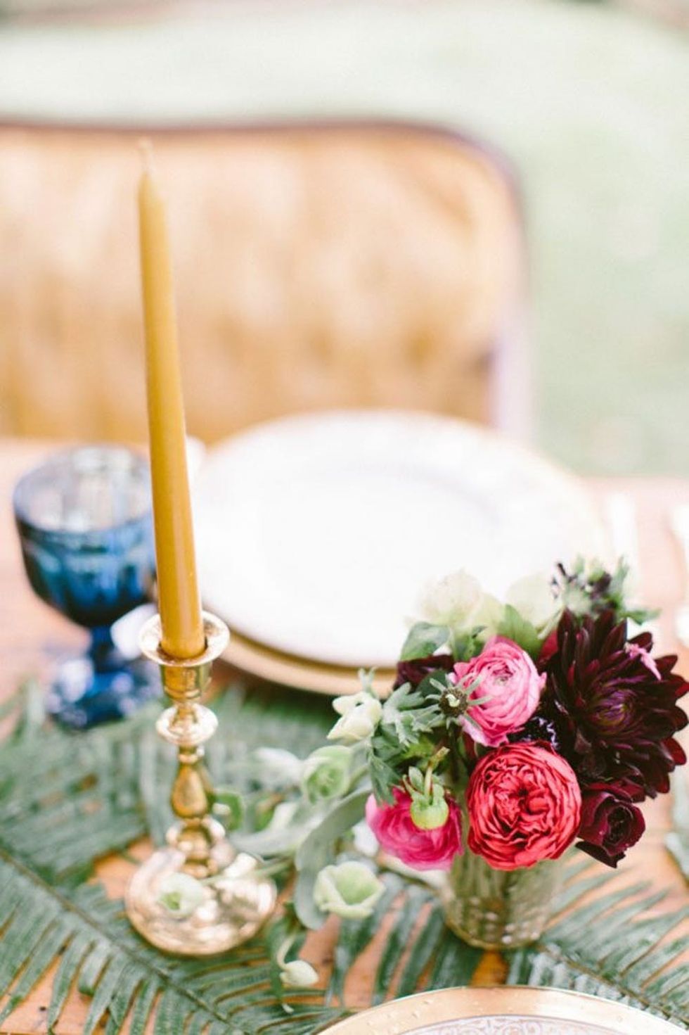 1. Subtle Centerpieces: The ranunculus is super versatile, so it can fit in seamlessly with any flora or decor theme. Going for a tropical vibe? Snag bright pink blooms and palm leaves like this setup. How about a boho vibe? Mauve ranunculus it is! See the trend here? (via Brianna Wilbur Photography / Style Me Pretty)