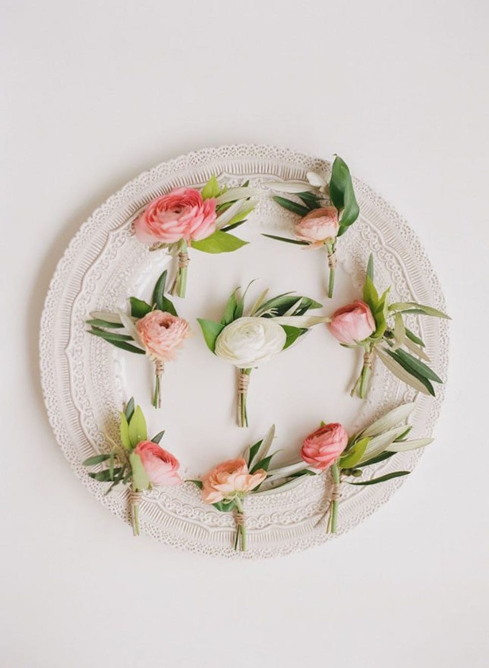 3. Pastel Boutonnieres: If the men are donning dark colors for your nuptials, pastel ranunculus will pop flawlessly on their lapels. A single blossom is the perf size for a boutonniere, so just add a sprig of greenery and wrap it with a touch of twine. (via Rebecca Yale Photography / Style Me Pretty)