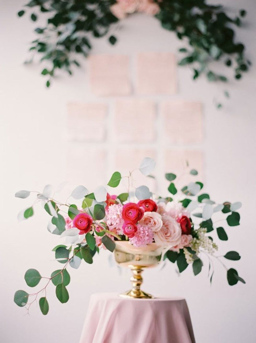4. Statement Decor: Bright, eye-catching ranunculus with sprawling silver dollar eucalyptus is a setup that’s sure to dazzle your guests. (via Justine Milton / Style Me Pretty)