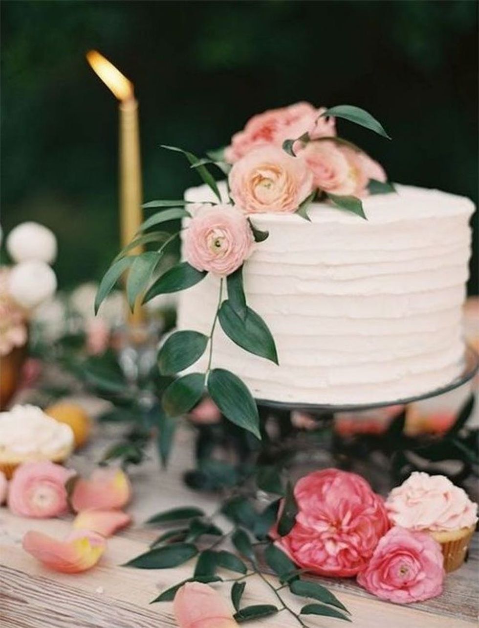 7. Ranunculus Cake Toppers: When you don’t want to go with a quote or figurines for your topper, drape ranunculus down the side of a naked or roughly frosted cake and you’ll be on your way to minimalist wedding perfection. (via Lani Elias Fine Art Photography / My Wedding)