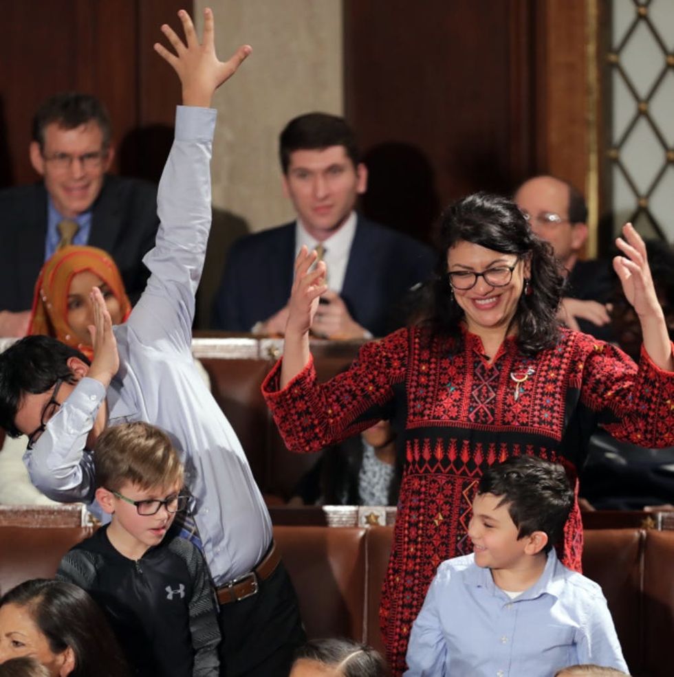 Although Tlaib’s mother wasn’t with her in Thursday’s session, new congresspeople are often joined by their families when they take their oaths of office. Tlaib’s two young sons stole the show as they dabbed in celebration alongside their mother for her historic first vote in the House.