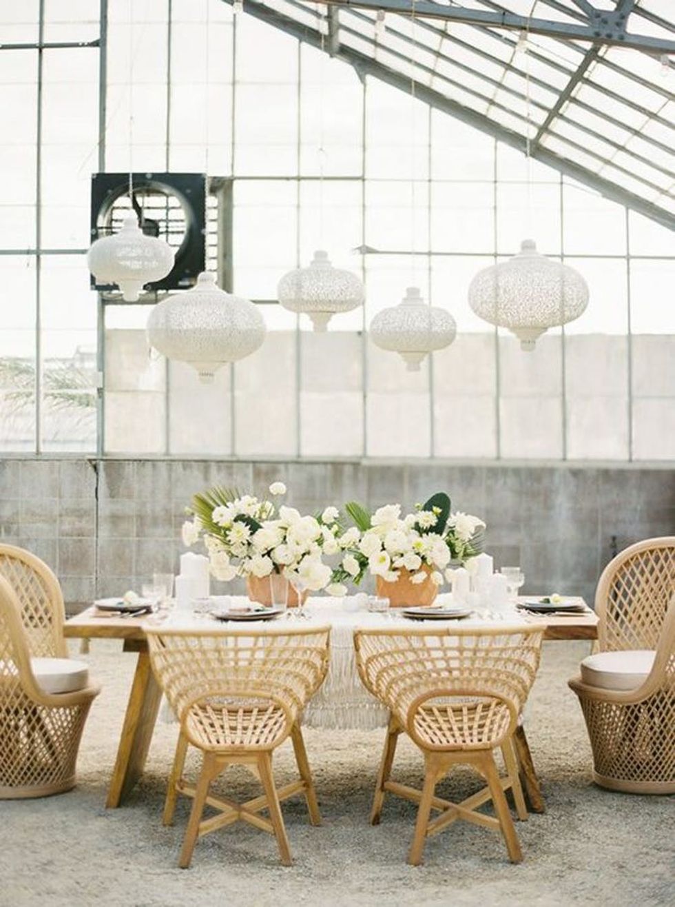1. Totally Tropical: If you’ve been digging the jungalow decor trend, use rattan chairs for your sweetheart table or intimate dinner setting. (via Indestructible Factory / Ruffled)