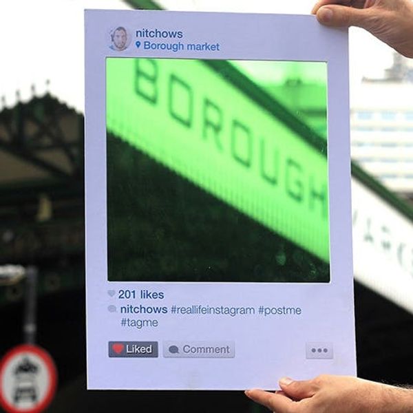 Artist Bruno Ribeiro has taken it upon himself to adorn the streets of London with a pretty thought-provoking and highly topical series, entitled Real-Life Instagram. He created an analog version of the app made of cardboard and different shades of cellophane (read: filters!) and has been sticking it to posts or walls all over London to frame famous landmarks, unusual views, and even other pieces of street art!