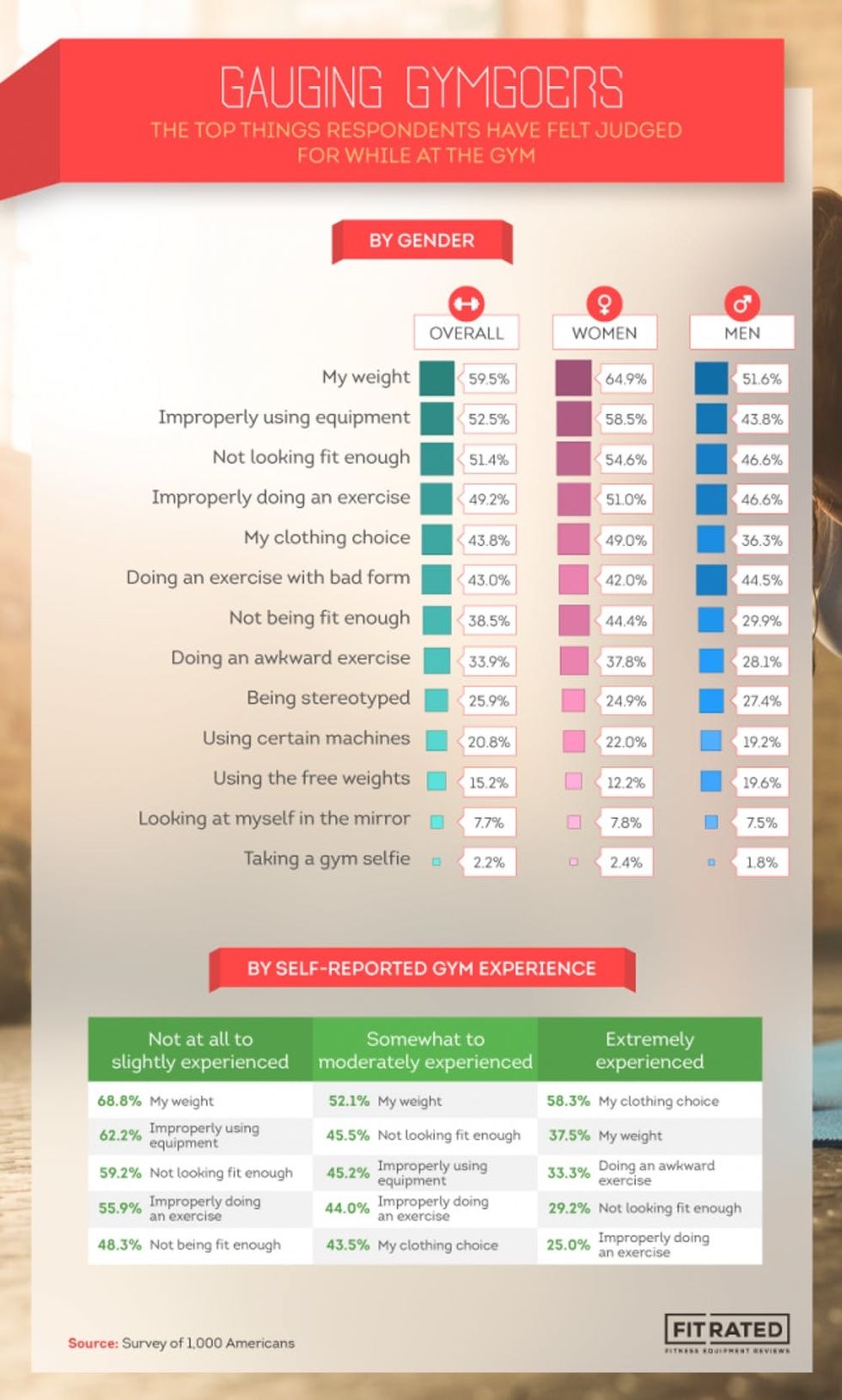 Surveying 1,000 Americans to learn their gym habits and opinions, this new survey found that 65 percent of women and 36 percent of men avoid the gym because they feel anxious or fearful of being judged while working out. What’s even more shocking is that this number jumps to upwards of 75 percent for respondents who felt that they were less attractive, less in shape, or less experienced in a typical gym environment. The most common gym anxiety for both women and men was the fear that they were being judged for their weight, with almost 60 percent of respondents admitting that they felt that they were being judged about their size by other gym-goers. The second most common anxiety was improperly using the equipment (52.5 percent), followed by not looking fit enough (51.4 percent), improperly doing an exercise (49.2 percent), and their clothing choices (43.8 percent).