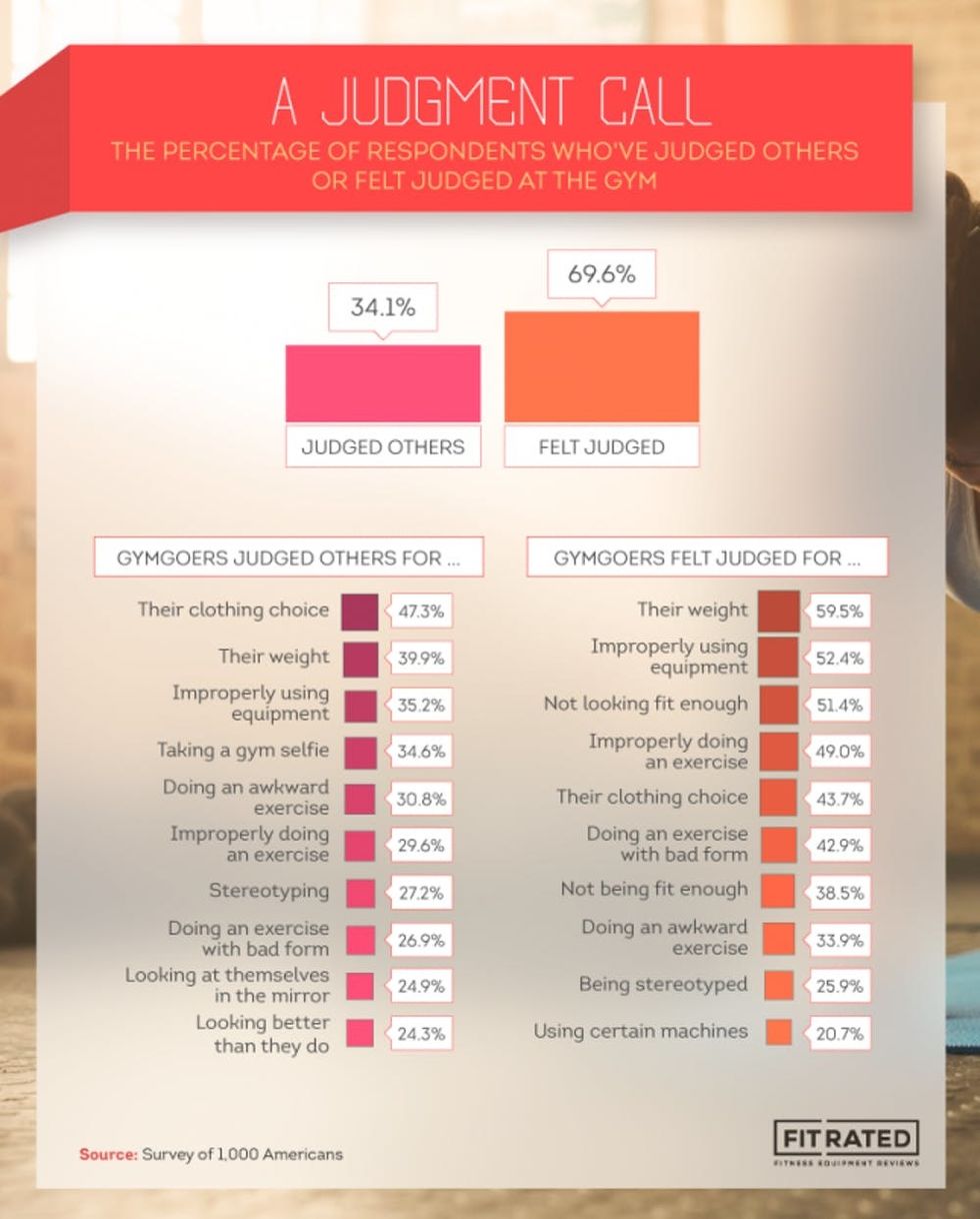 Unfortunately, this problem is a two-way street. Of the 1,000 people surveyed, one-third of respondents admitted to judging others while at the gym. While gym-goers felt most judged for their weight, the most common reason that people admitted to judging others was over other gym-goers’ clothing choices (47.3 percent), followed by their weight (39.9 percent), improperly using the equipment (35.2 percent), and taking a gym selfie (34.6 percent). Those who preferred anaerobic exercises like weightlifting were the most judgmental group, trailed by those who preferred aerobic exercises like running and cycling.
