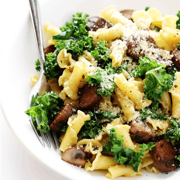 Spicy, salty sausage has the necessary oomph to stand up to hearty greens like kale. Toss the two with sautéed mushrooms, pasta, and grated cheese for a wholesome dish. (via Gimme Some Oven)
