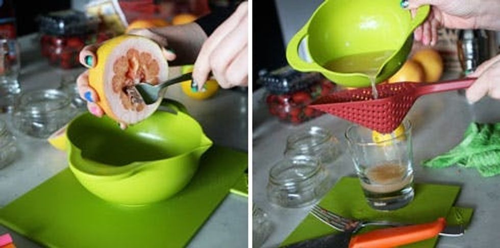 Next, time to prep your juices and fruits. For the grapefruit juice, we couldn’t find our juicer so we got scrappy and used a combination of brute strength and a fork. We do recommend a juicer though! :)
