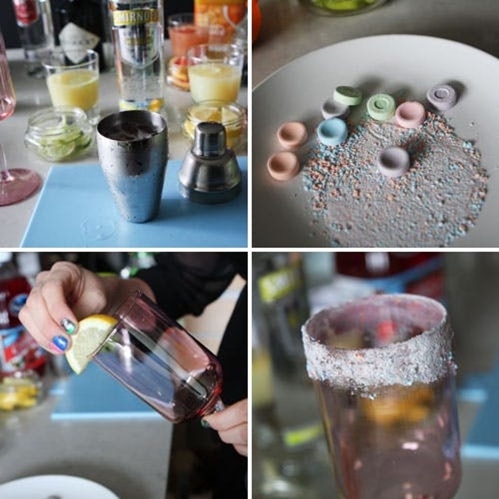 Pour all ingredients in a shaker over ice, shake, and strain. For the rim, we used a lemon wedge to moisten the edge of the glass. We wanted a Swee tTart rim so we got out our trusty hammer and ziploc and crushed a handful of Sweet Tarts. Then, roll your glass in the simple syrup and repeat with the crushed Sweet Tarts. Why Sweet Tart sanding sugar does not yet exist, we really don’t know. Pour your drink over ice, add a slice of lemon on the top, add a couple Sweet Tarts, et voila!