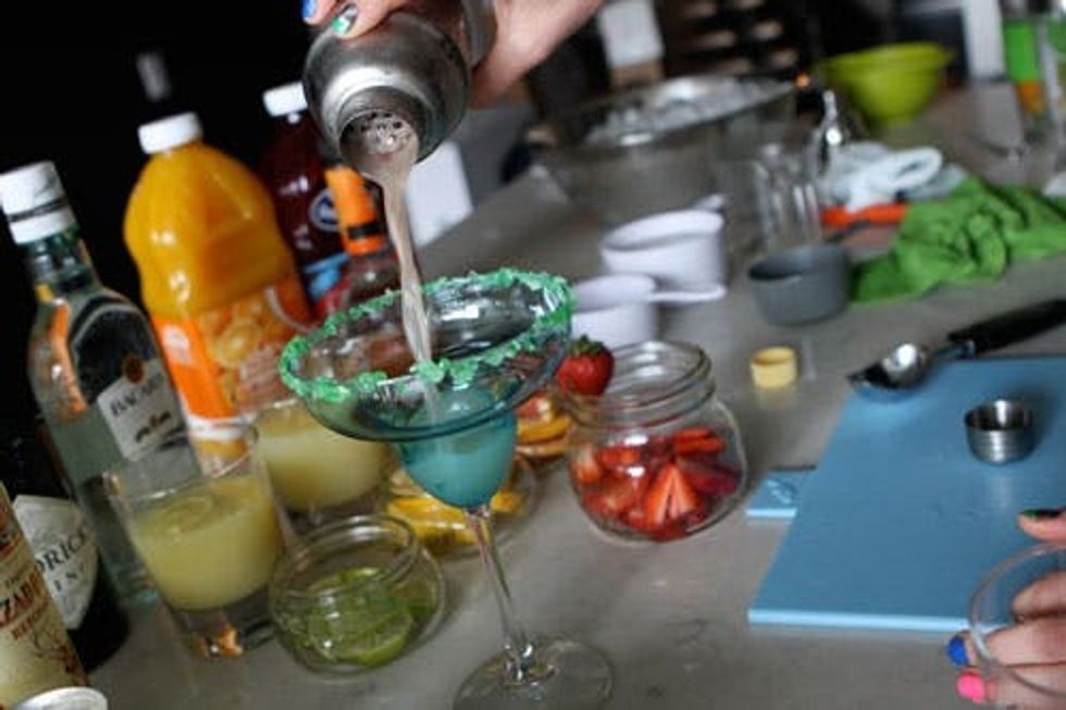 First, we created a blue rum infusion. Pour 2-4 fl oz of rum into a glass or jar, and add a few blue raspberry Jolly Ranchers. Let sit for at least an hour. Once your rum is looking good and blue, you’re ready to shake things up.