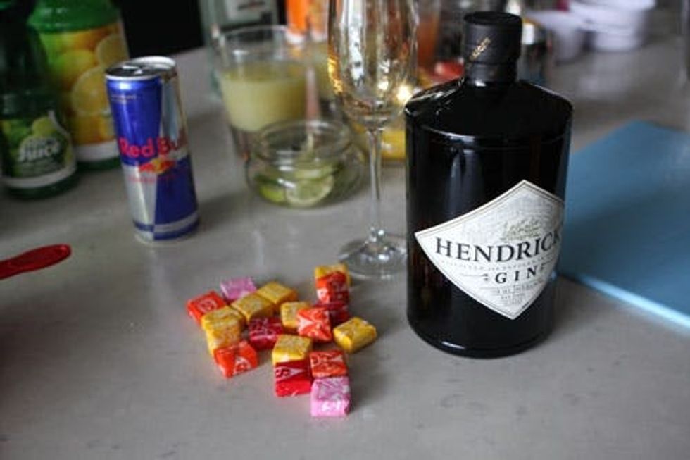 Our second infusion of the day is made with red Skittles. Pour 2-4 fl oz of vodka into a glass or jar, then add a splash of Red Bull and a handful of red Skittles. Let sit for at least an hour. Once your vodka is looking good and red, you’re ready to shake things up. Spoon out the Skittles and discard.