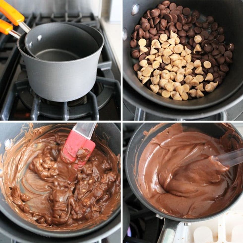 To melt the chocolate chips, we used our trusty double boil method. Fill a medium pot with an inch or two of water, and then put a smaller pot in that. Heat on medium so that you’re able to heat the chips gently. Pour in a cup of peanut butter chips and chocolate chips as well as a tablespoon of vegetable oil and stir until you get the right consistency.