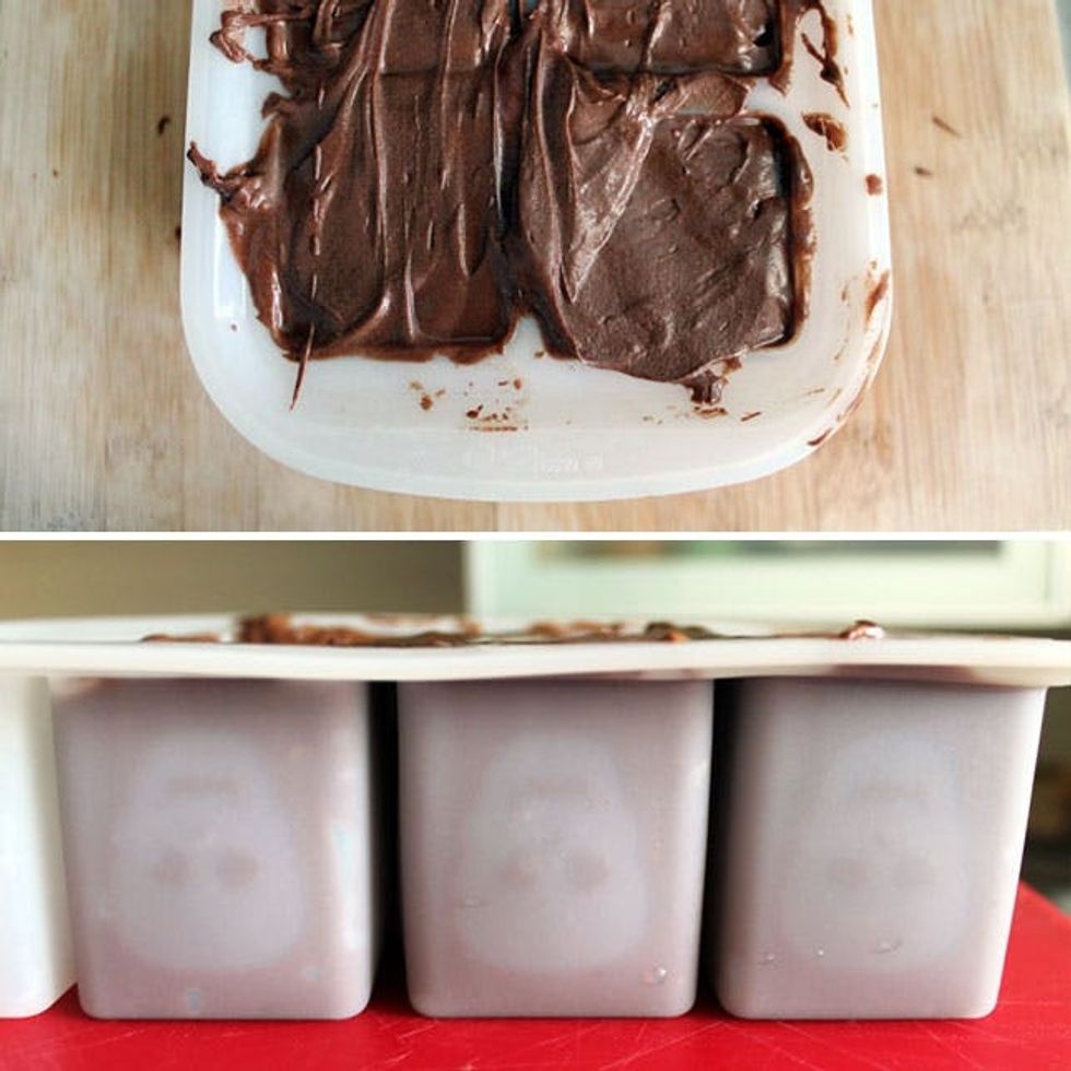 Pour into your mold! A lot of chocolate goes a little way in the case of silicone molds so prepare to do a batch of two of chocolate melting. Be sure to use a spatula or knife to push the chocolate down into the mold.
