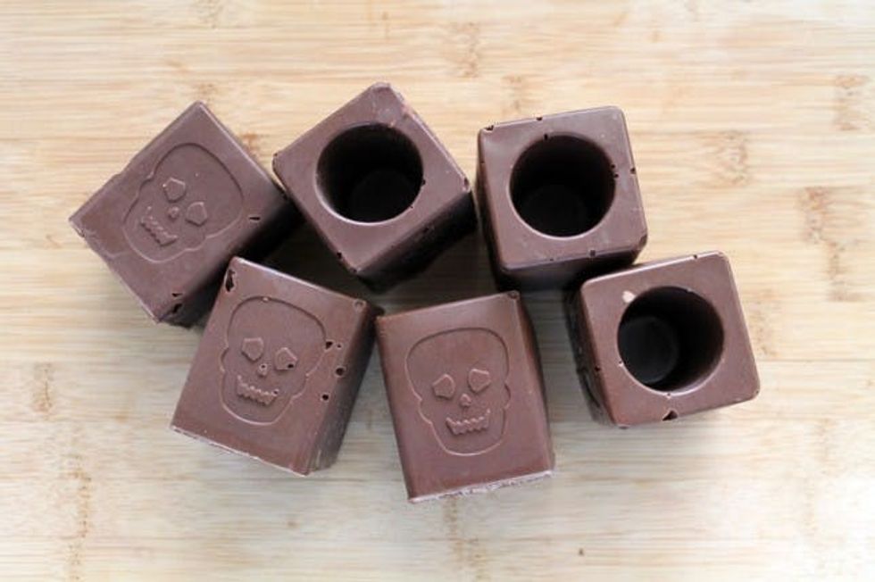 We happened to have a shot glass ice cube tray with skulls on it, perfect for Halloween. Of course, any shot glass ice cube tray will do.