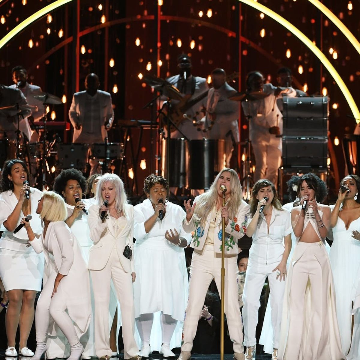 When Kesha performed at the Grammys at the end of January, everyone was talking about her emotional and powerful performance of the song, “Praying.” Her first performance since her legal battle with Sony Records holds a lot more weight at a time when the #MeToo movement and Time’s Up initiative are addressing sexual harassment in the movie and music industries, and beyond. But she didn’t perform the song solo. The artist had the help of Cyndi Lauper, Bebe Rexha, Camila Cabello, Andra Day, Julia Michaels, and members of the Resistance Revival Chorus. And that last addition is no coincidence.