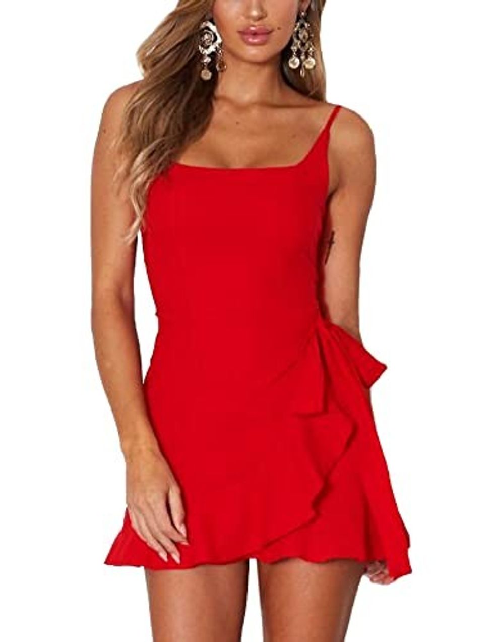 Hot nights are ahead, and this dress is up for the occasion. This Relipop Women's Spaghetti Strap Waist Tie Knot Wrap Front Ruffle Hem Short Dress is the perfect little red dress. Wear with some red pumps and black eyeliner.
