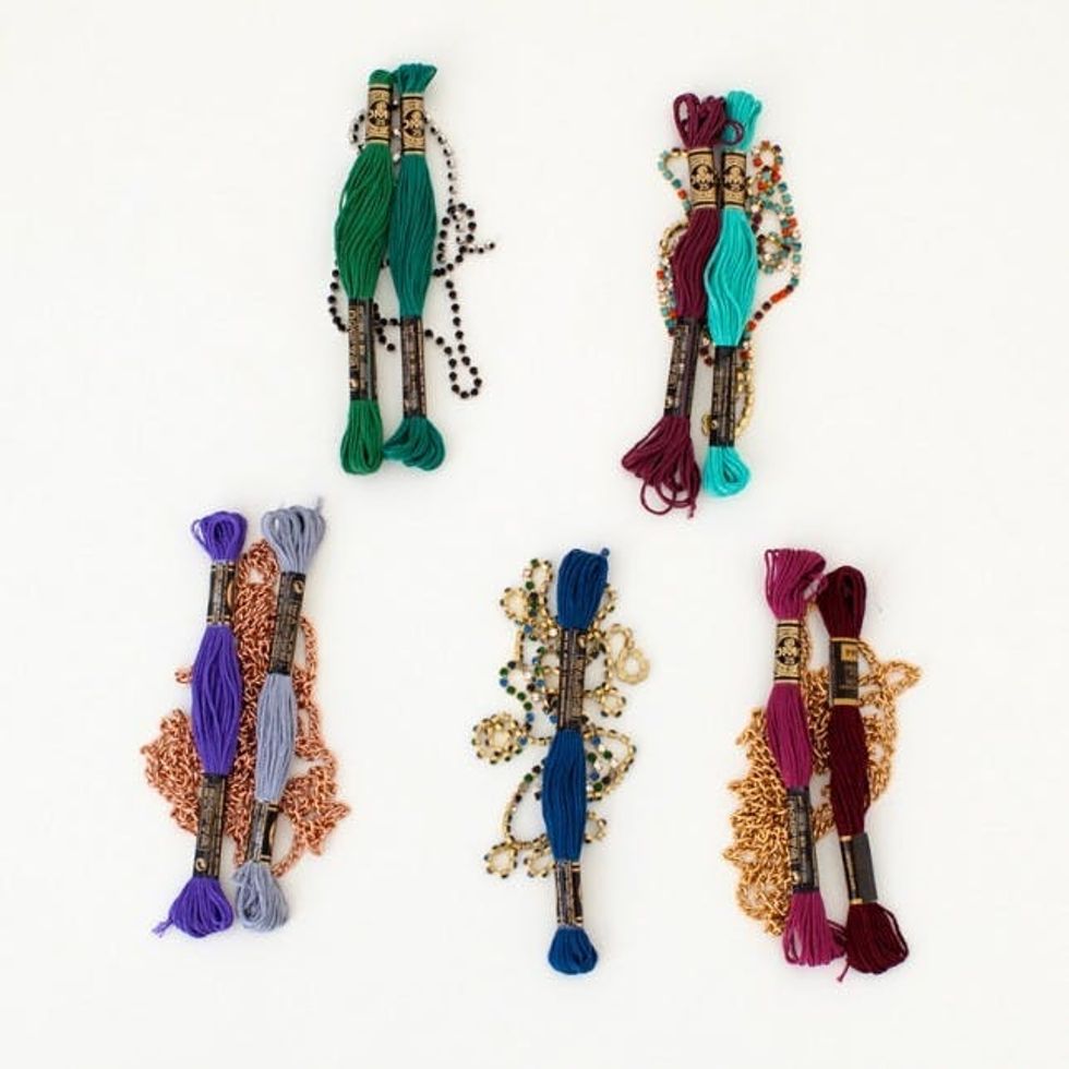 Tie two pieces of embroidery floss to one end and wrap around each rhinestone link. Continue to the end and tie off. Secure with a dab of glue, let dry, and you’re done!