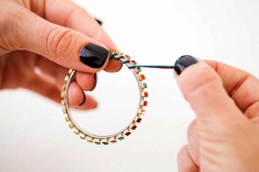 For this one, we used a multicolored rhinestone chain with turquoise and maroon embroidery floss. Squeeze a dab of glue along the outer edge of the hoop. Press the rhinestone onto the edge and hold in place while the glue dries. Snip off any excess chain.