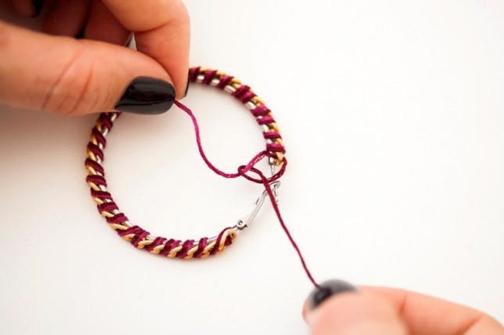 You’ll start out doing the same thing as with the rhinestones. Squeeze a dab of glue along the outer edge of the hoop and press the chain onto the edge. Hold while the glue dries and snip off excess chain. Tie the embroidery floss on one end and wrap. That’s it!