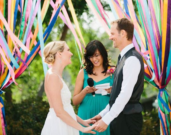 10. Ribbon Gazebo: If you’re lucky enough to have a gazebo or pergola to work with as your altar, hanging multicolored ribbons from the top should be a cinch. We think this adds some great color to an otherwise neutral landscape. (via Style Me Pretty)